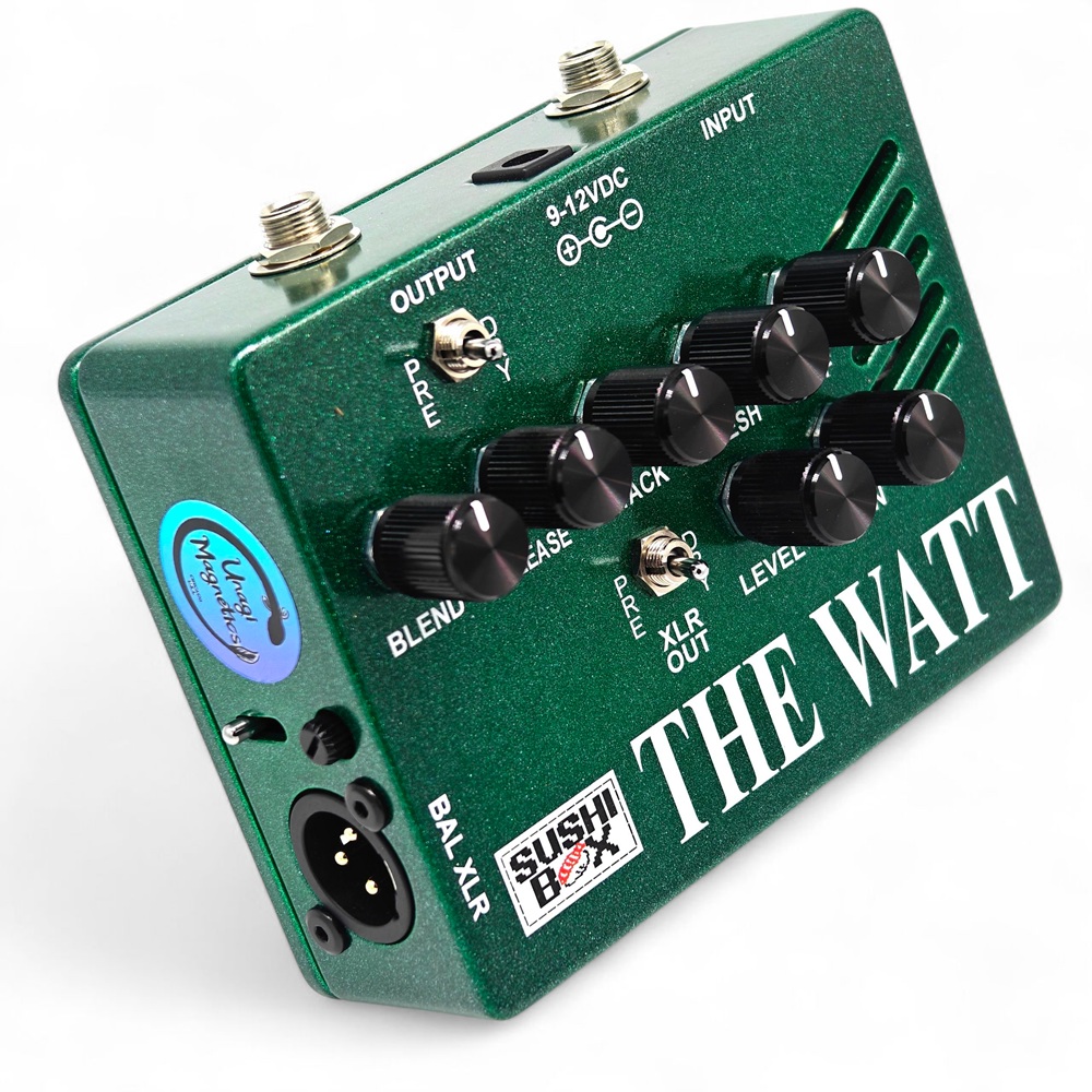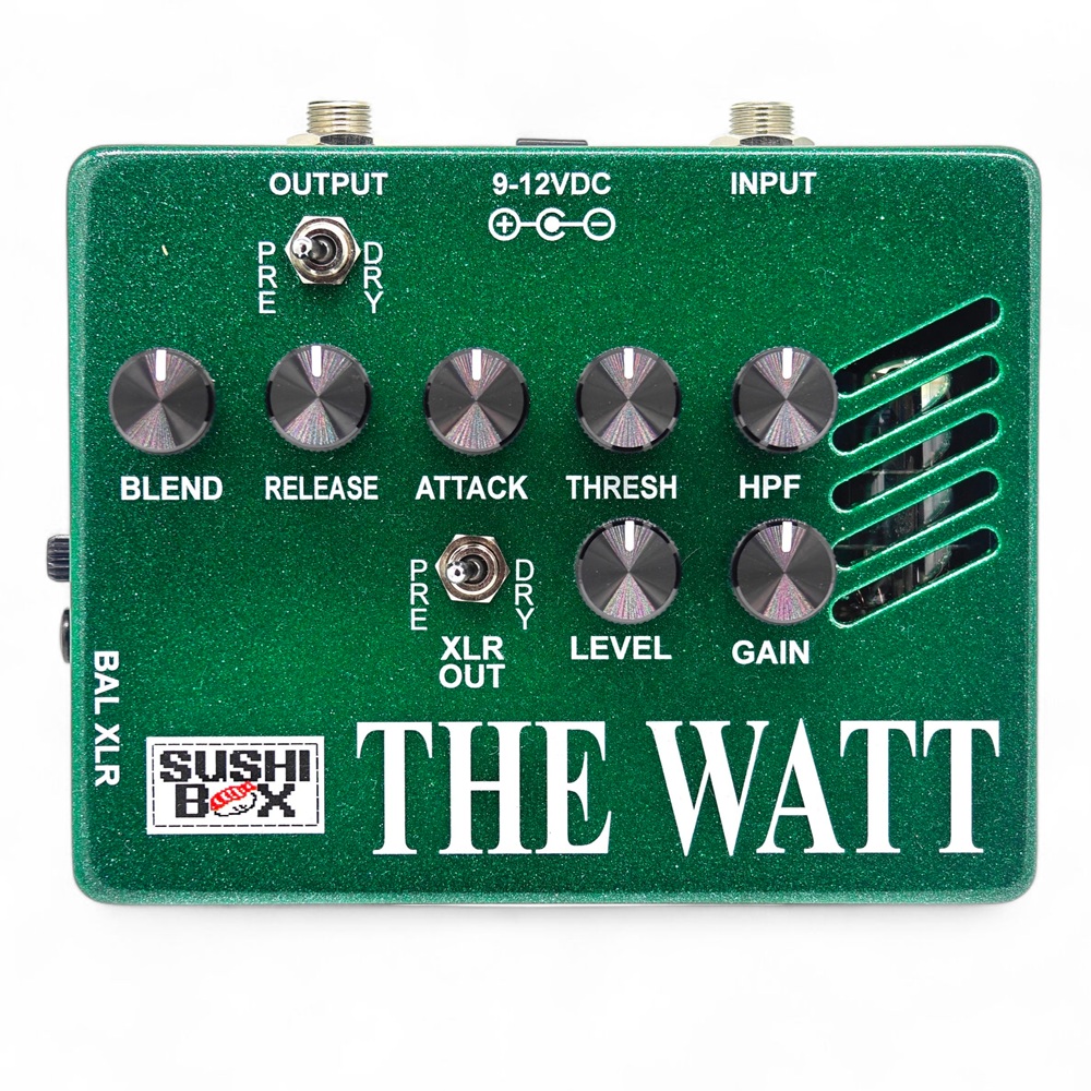 The Watt was born from a collaboration with the legendary Mike Watt, who asked if I could make a single box that combined the two main pedals he was gigging with, Finally and Single Slice. The Watt is the result, a compact box providing a tube preamp, adjustable frequency high-pass filter (HPF), and compressor, with both a 1/4″ and XLR output, both of which are bypassable for flexible signal routing.